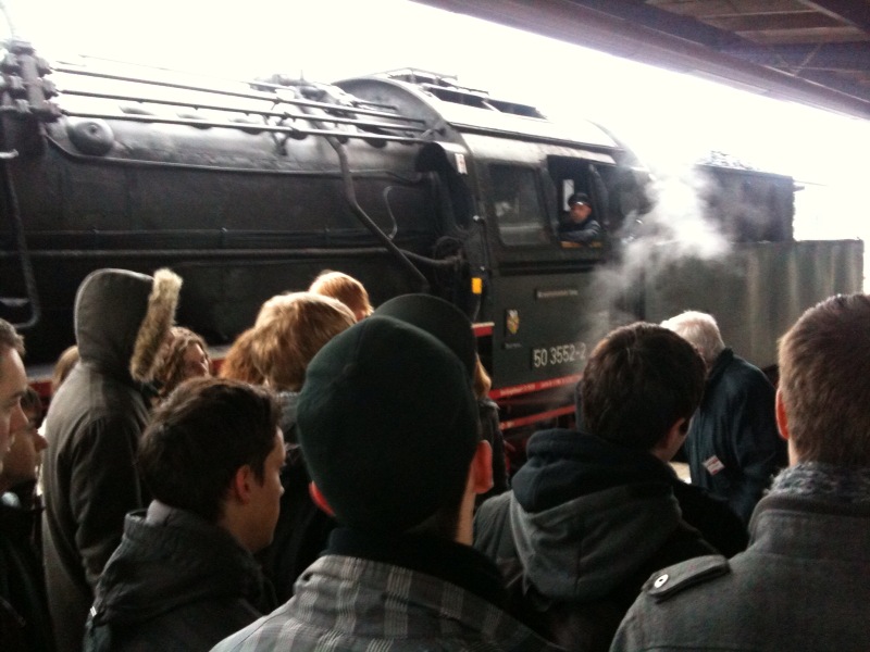 Auf Gleis 5 bilden sich seit Sonntag Warteschlangen, da die engen Ausstellungsabteile den Ansturm nicht mehr bewältigen. Lokale Helfer stärken das Zugteam, das bis zu 14 Stunden arbeitet, um Einführungen insbesondere für Schulklassen zu geben (Öffnungszeiten 08.00 Uhr bis 20.00 Uhr, bedarfsweise länger).