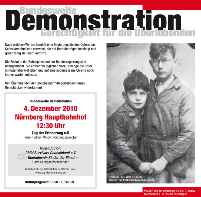 Bundesverkehrsminister Ramsauer (links) und Bahnchef Grube (rechts) feiern 175 Jahre deutsches Eisenbahnwesen. Das Jubiläum soll Nürnberg und Fürth, die Städte der ersten regulären Schienenverbindung, in Partylaune versetzen. Im Musical "Bahn frei" hat die "Ludwigsbahn-Samba" Premiere und der "Lampenfieber-Blues" lässt die "Goldenen Zwanziger Jahre" auferstehen. Auf Großleinwänden präsentiert das Nürnberger Planetarium die "Geschichte der Mobilität" und versetzt das Publikum in einen "Rausch der Bilder" (Nürnberger Nachrichten). Die Erinnerung an 3 Millionen Menschen, die von den deutschen Eisenbahnen in den Tod gefahren wurden, lässt sich mit der Nürnberger Partylaune nicht vereinbaren. Das Großereignis, das am 7. Dezember seinen Höhepunkt erreichen soll, wirkt obszön.