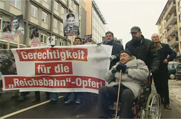 In den europäischen Nachbarländern wird der "Reichsbahn"-Opfer gedacht. Das Foto zeigt Adam Bielak, einen "Reichsbahn"-Deportierten aus Polen, der am "Zug der Erinnerung" die Toten ehrt. In der Bundesrepublik Deutschland wird das Ausmaß der "Reichsbahn"-Verbrechensbeihilfe noch immer verschleiert. Ohne die "Reichsbahn" wäre es unmöglich gewesen, etwa 3 Millionen Menschen in die Vernichtungslager zu verschleppen. In zahlreichen Fällen mussten die Deportierten ihren Weg in Elend und Tod selbst bezahlen. Dabei nahmen "Reichsbahn" und Verkehrsministerium Millionensummen ein. Bis heute weigern sich die Täter-Erben, diese Einnahmen zu erstatten, und bieten den Opfern Brosamen an. Haben DB AG und Verkehrsministerium kein Geld? Allein für den Umbau der Stuttgarter Bahnhofsanlagen stellen DB AG und Verkehrsministerium 2,6 Milliarden Euro zur Verfügung. Für den Ankauf eines britischen Bahnkonkurrenten zahlt die DB AG in diesem Jahr 2,7 Milliarden Euro. Die DB AG ist auf dem europäischen Logistikmarkt Nr. 1 und will unter anderem nach Polen sowie in die osteuropäischen Staaten expandieren. Die DB AG muss die Opfer, denen das Vorgängerunternehmen ("Deutsche Reichsbahn") Gesundheit und Leben runierte, angemessen entschädigen.