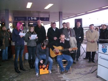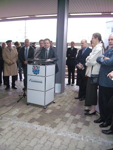 Ansprache der Bürgerinitiative bei Einfahrt des Zuges auf Gleis 1 des Hauptbahnhofs Saarbrücken
